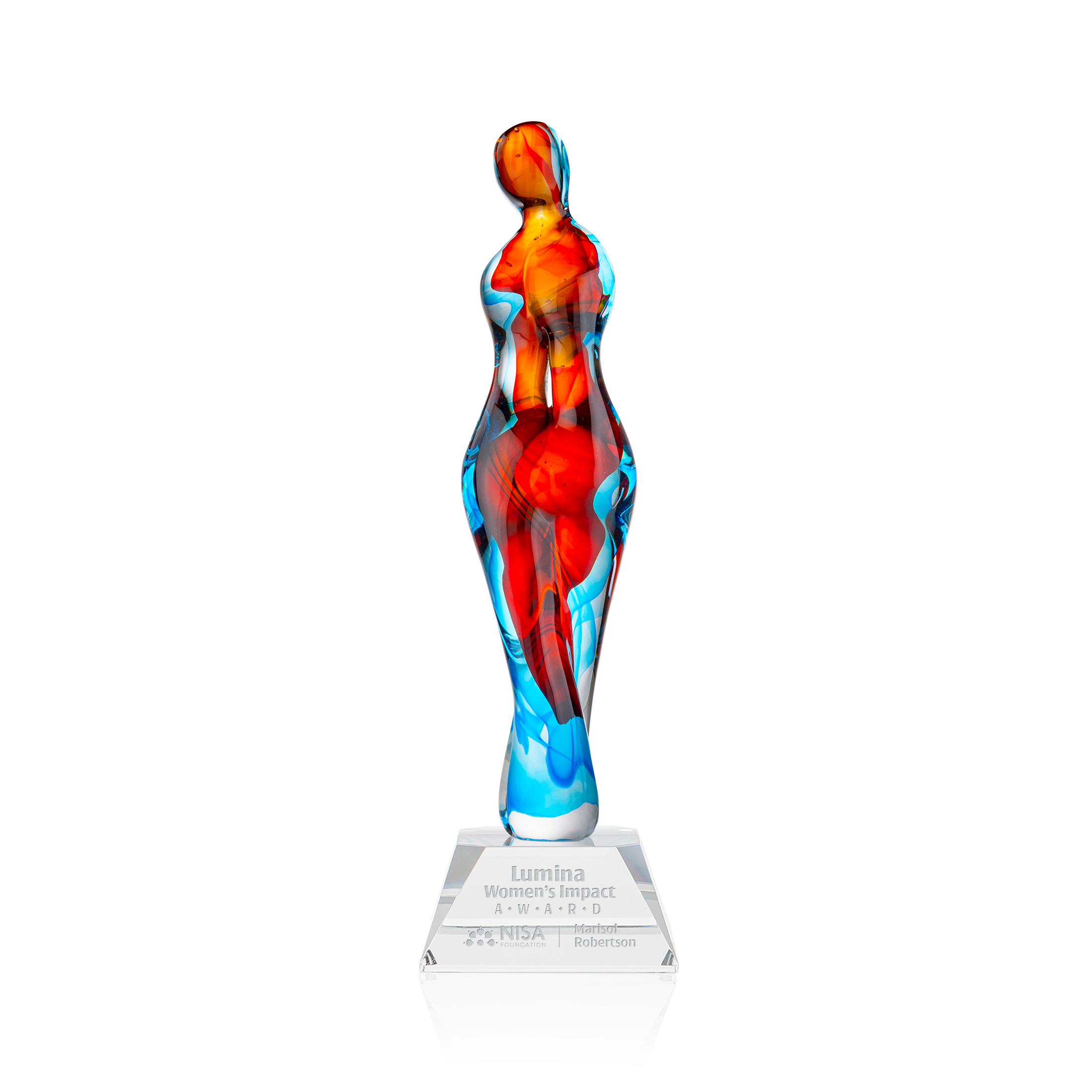 The Venus Award is a contemporary art-glass sculpture featuring an elegant female silhouette with flowing swirls of vibrant red, amber, and cool blue suspended in clear crystal. Its sleek, light-catching form creates striking depth and movement from every angle. Designed as a premium recognition piece, it’s ideal for honoring leadership, achievement, philanthropy, or humanitarian service at corporate events and special ceremonies. The award is mounted on an optical crystal base, available in clear, black, or blue.