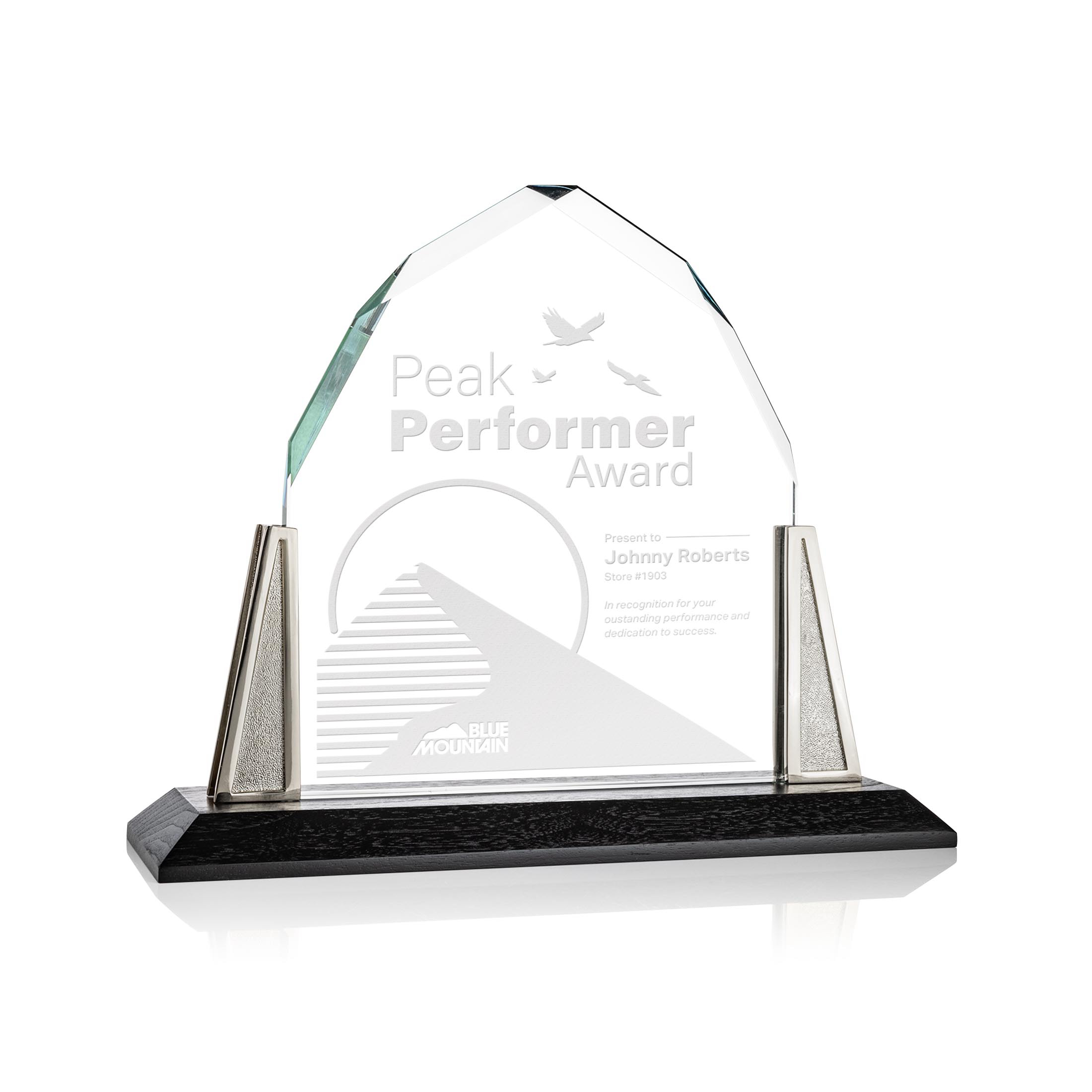 The Avalon Award is beautifully crafted from premium Starfire crystal, featuring a distinctive peaked silhouette that delivers exceptional clarity and brilliance. Accented with striking pewter angle posts that frame the design with a refined, contemporary touch, it creates a bold and elegant presentation. Mounted on a sleek black base for added stability and contrast, this award is also available with gold posts for a warmer finish.