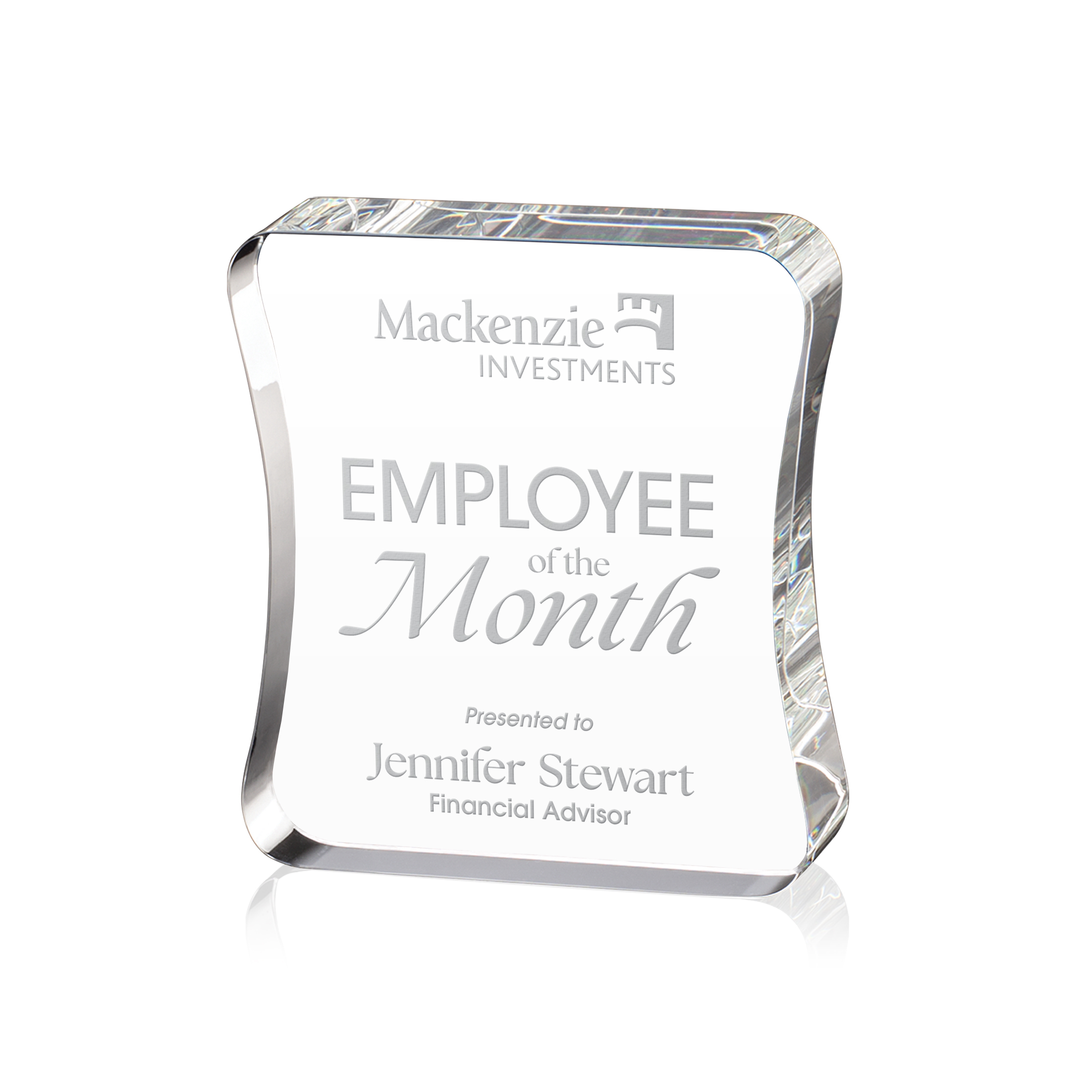 The Barre Optical Crystal Award is a curved rectangular award that contours inward, creating a large imprinting area.