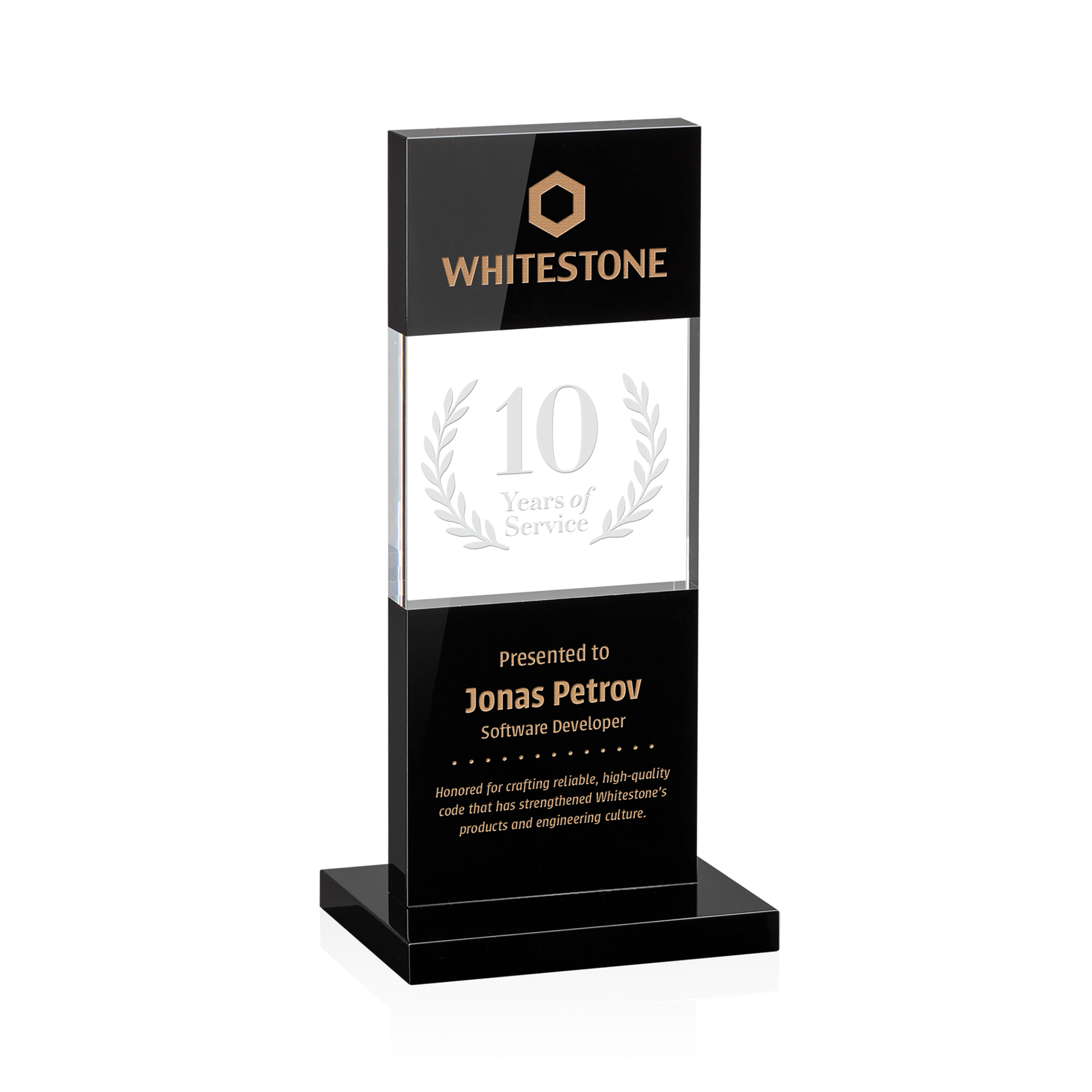 A sharply contrasting award, the Basilia intersects deep black crystal with a squared clear panel optimized as the perfect imprinting area to spotlight your recognition message.