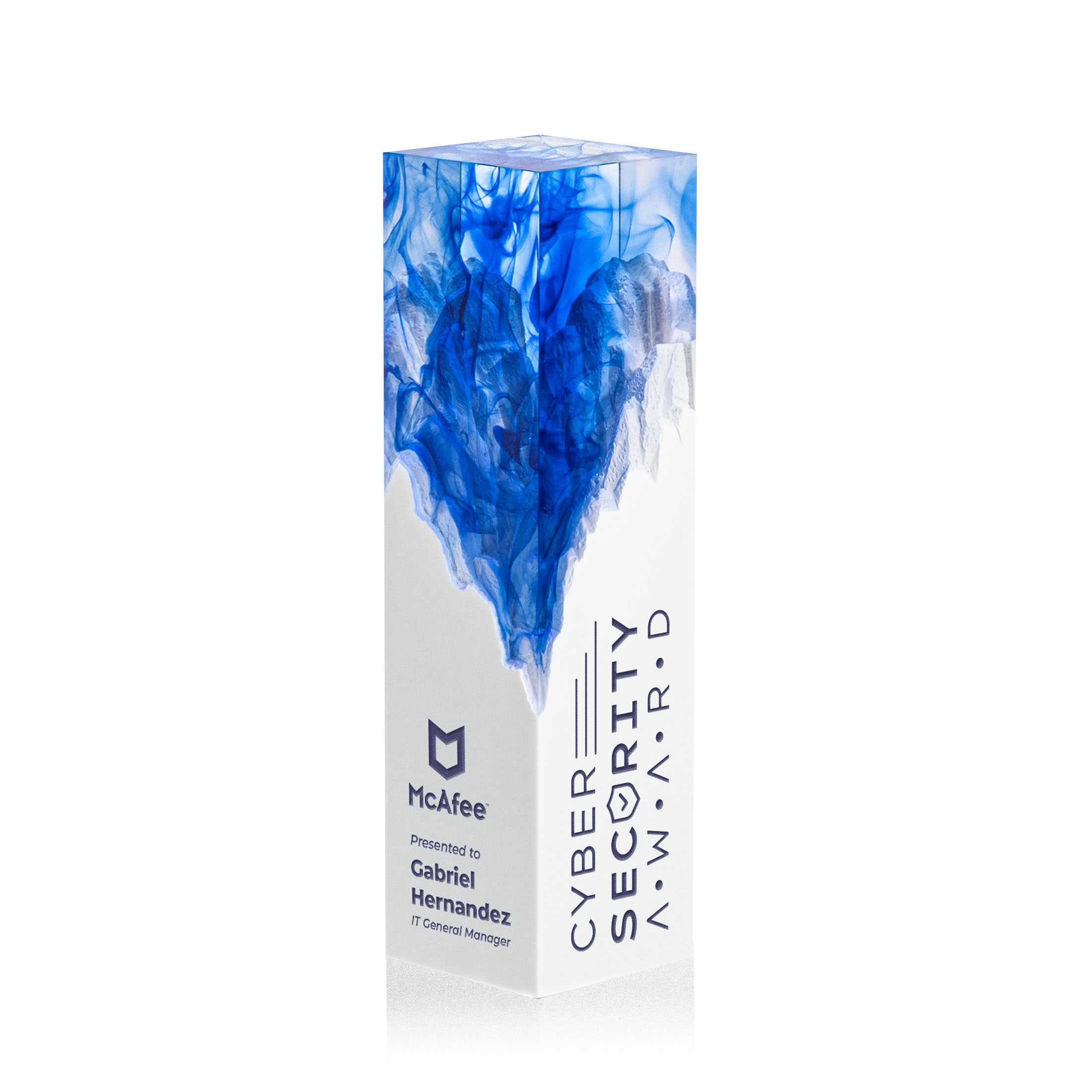 The striking Brandino Award is a symbol of excellence and achievement. Featuring a white Polystone base with a mountainous texture and a clear lucite top, each piece is hand-poured to create a unique, smoke-like design. A bold, freestanding trophy that celebrates success with style. Available in blue, green, red, or orange.