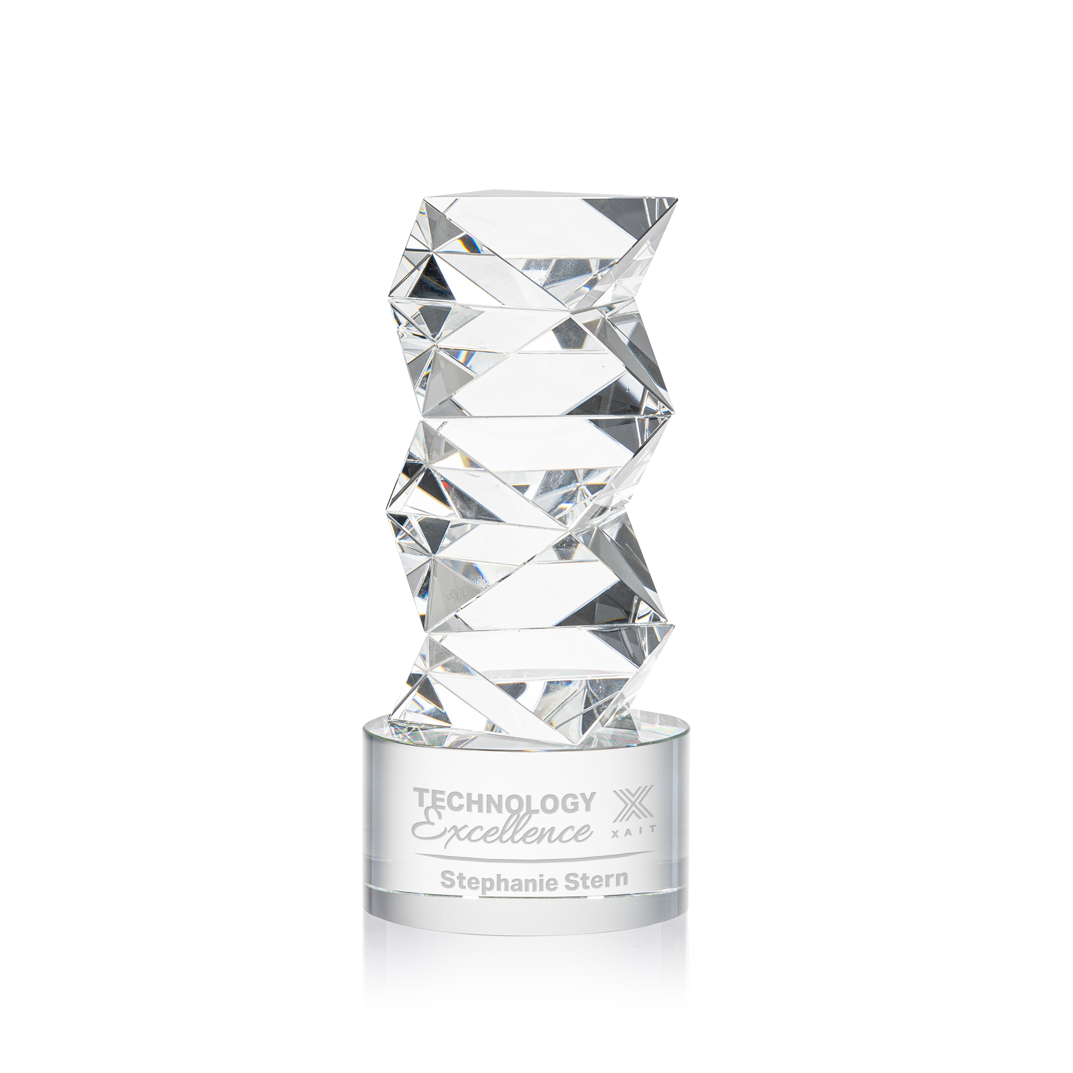 The Callucci Award on Optical Crystal Base is a striking symbol of innovation, featuring interchanging cuts and dynamic facets that brilliantly refract light from every angle. Crafted from pure optical crystal, its stacked geometric design captures a sense of forward motion and modern achievement. The solid crystal base offers space for personalized engraving, making it ideal for honoring excellence in any industry.