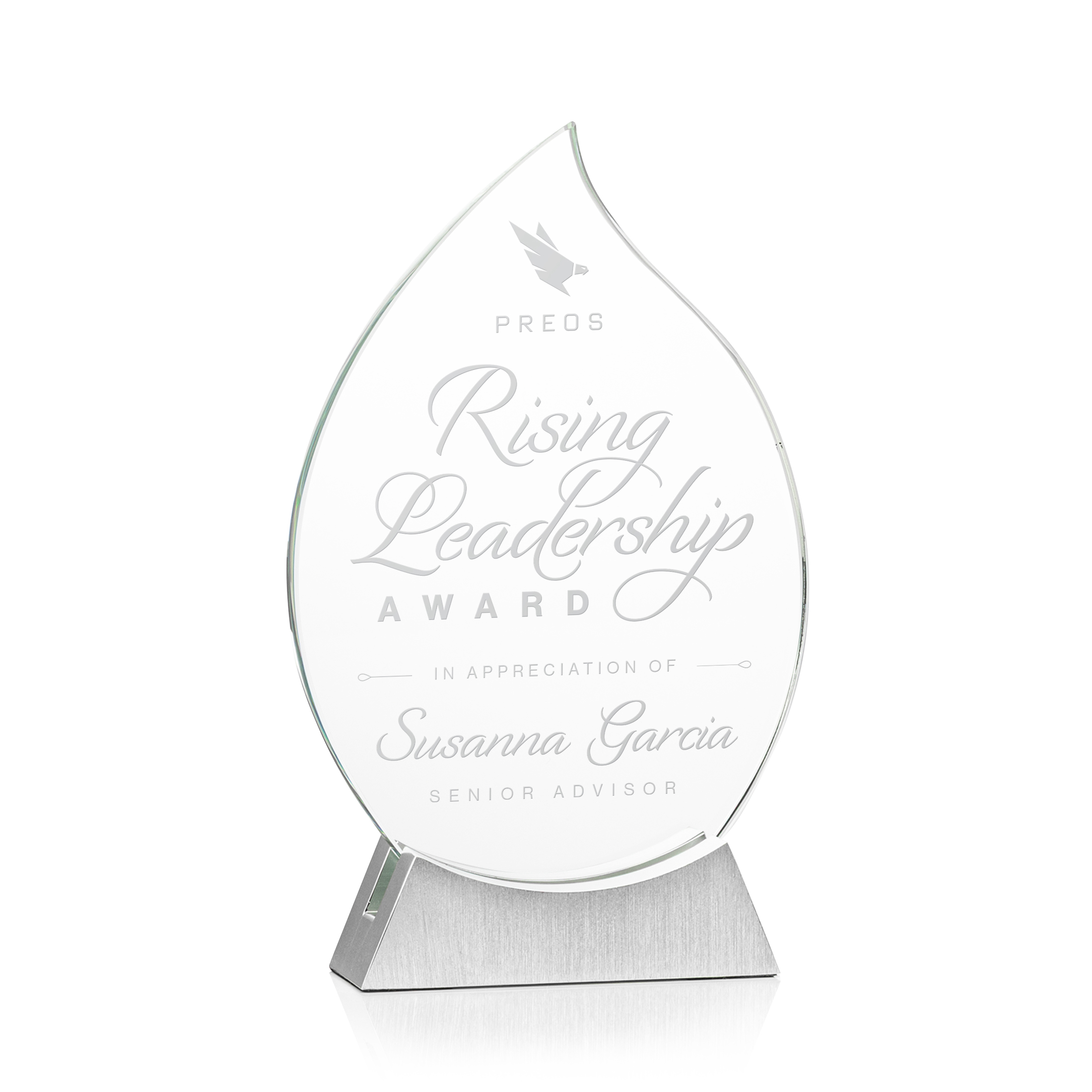The stunning starfire crystal Carmack Award features a graceful flame/teardrop shape, symbolizing inspiration, growth, and achievement. Mounted on a sleek brushed aluminum base, it combines modern elegance with timeless design. Perfect for honoring rising leaders, top performers, or milestone accomplishments, this award leaves a lasting impression of prestige and recognition.