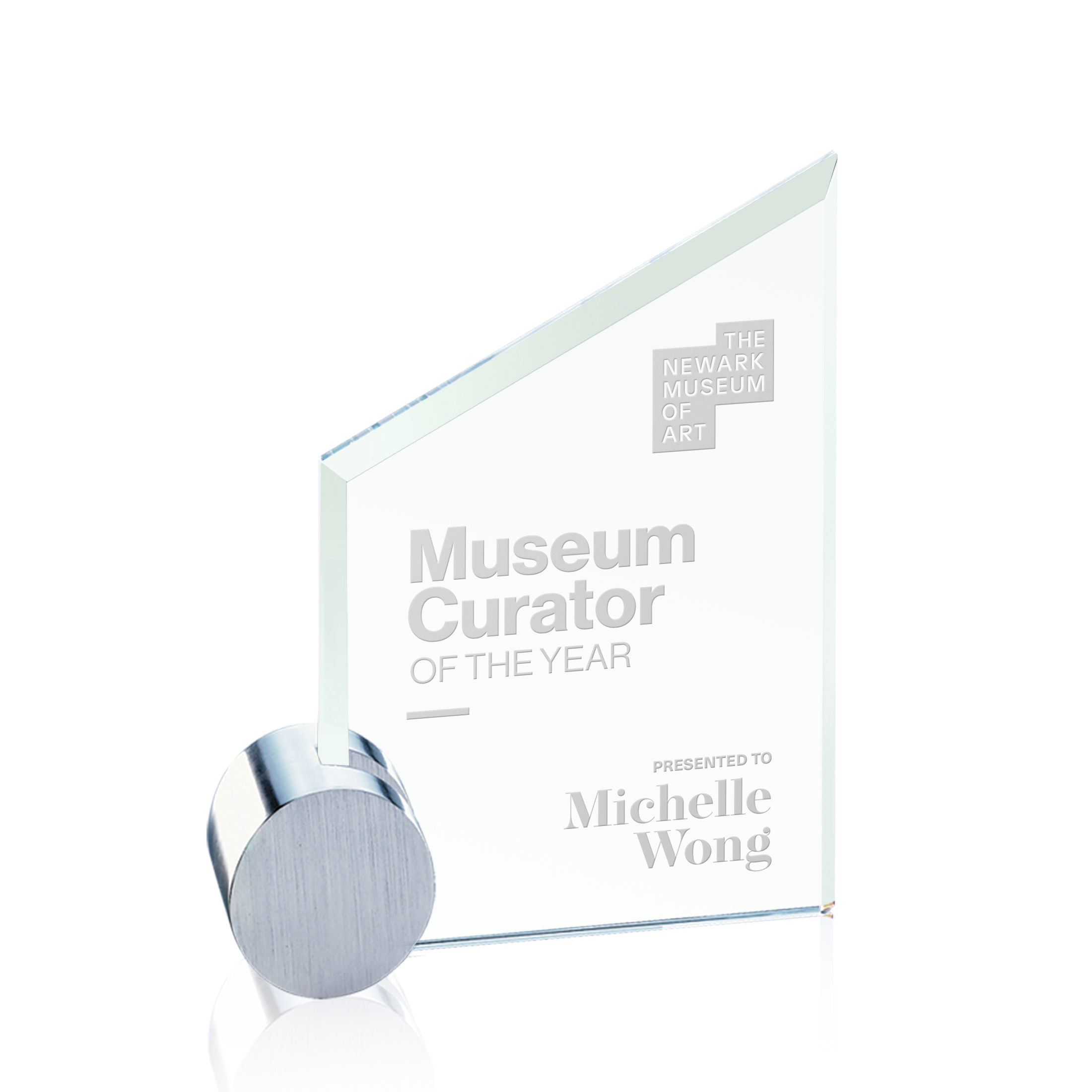 The Cooper features a slant topped 3/8" thick jade glass upright with beveled edges, supported by an aluminum corner disk or star holder in either gold or silver finish. Also available in starfire crystal.