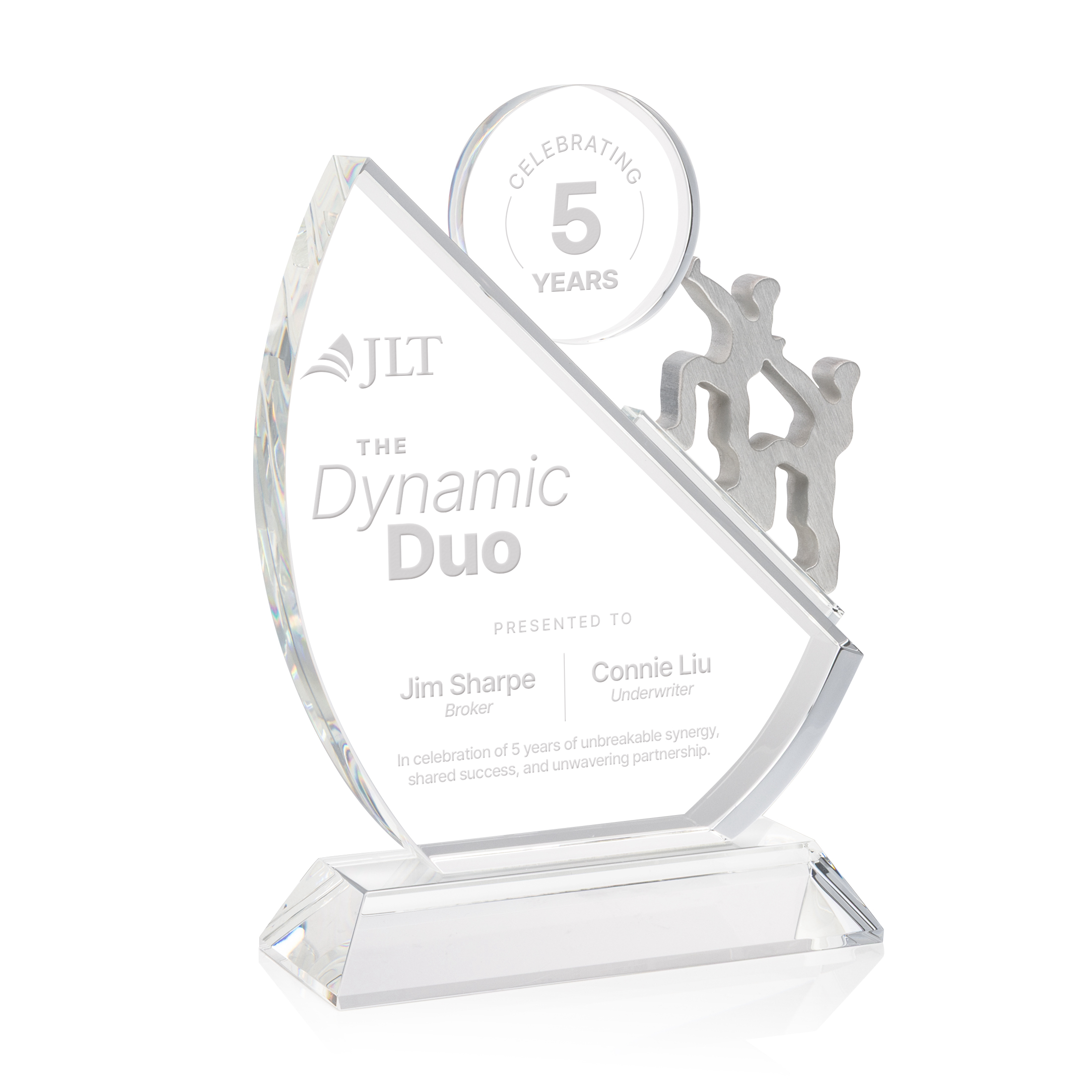 The Cooperation Award is the embodiment of overcoming adversity through teamwork and cooperation. This charming piece features the story of two peers, cut from brushed aluminum, facing an uphill battle along the angular edge of this optical crystal award.