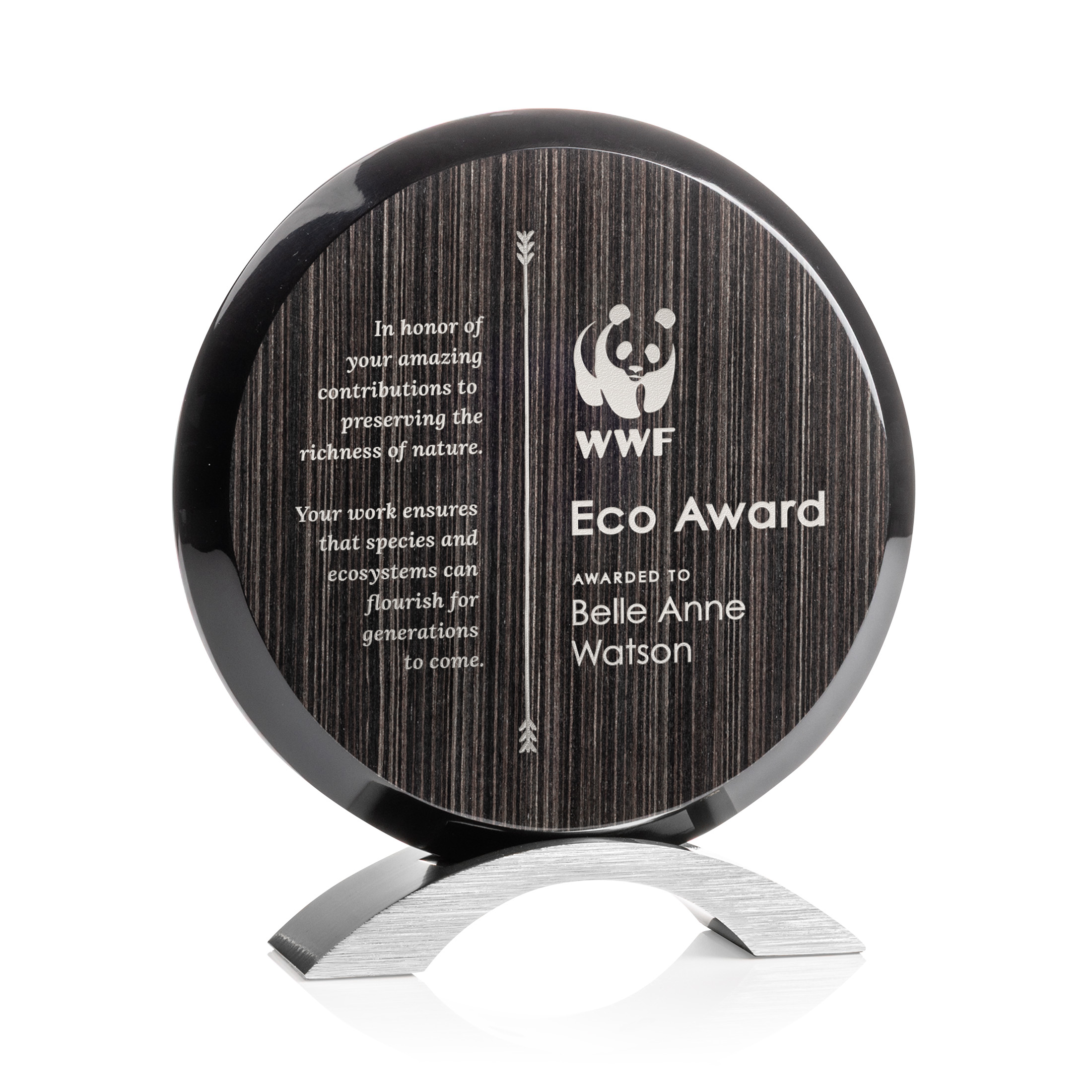 The Doavan Slatewood Award features a rich slatewood-inspired composite circle paired with a sleek aluminum base for a refined, modern presentation. Its rounded silhouette and deep woodgrain backdrop create striking contrast that highlights engraved text and logos. The brushed aluminum base adds stability and contemporary elegance, making this award a standout recognition piece. Available in gold or silver.