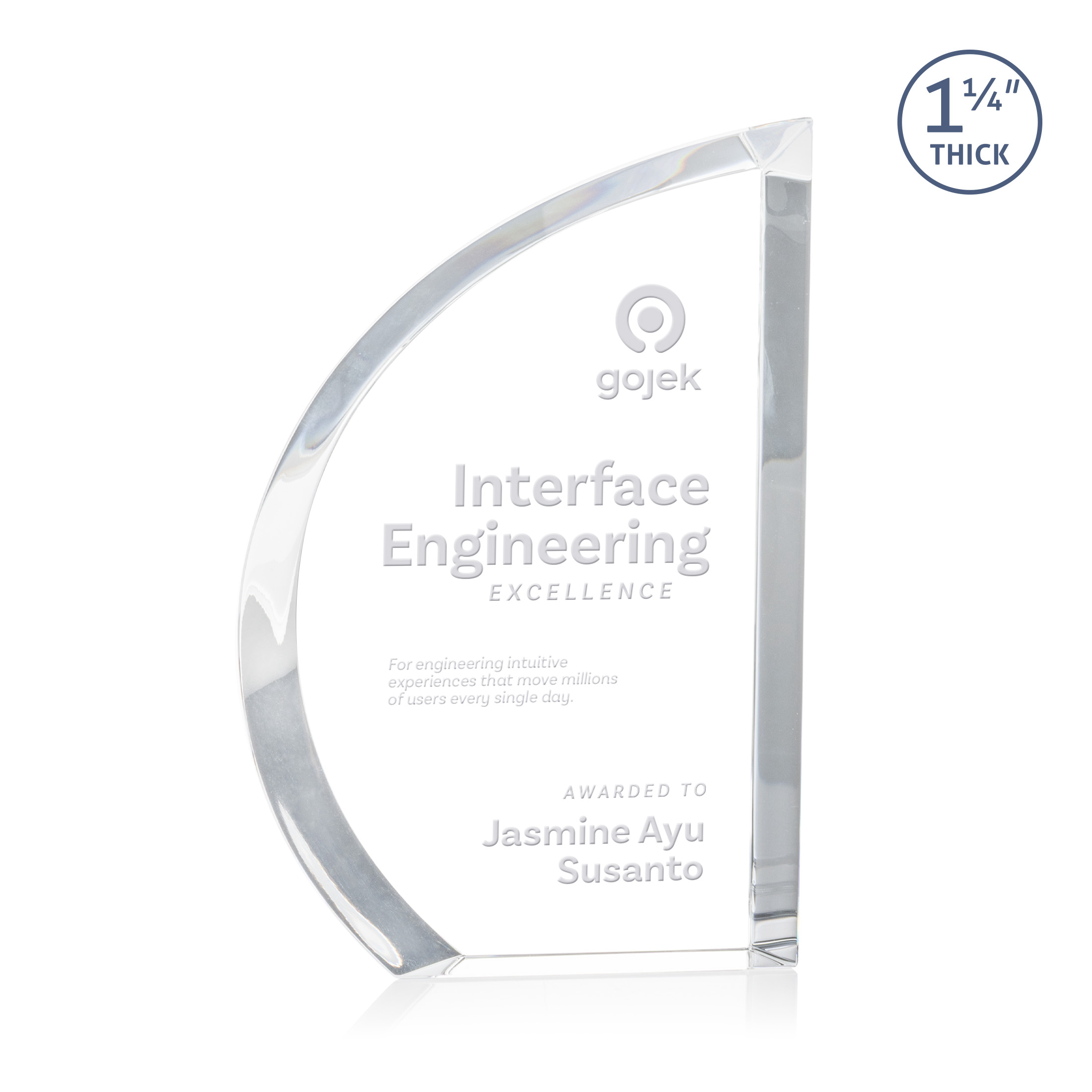 The freestanding Fenworth Award is crafted from brilliant optical crystal and features a bold, contemporary design with a sweeping curved edge and polished facets. Measuring an impressive 1¼" thick, its substantial profile enhances the crystal’s clarity while creating striking reflections of light. A sophisticated and modern recognition piece, perfect for honoring excellence and outstanding achievement.