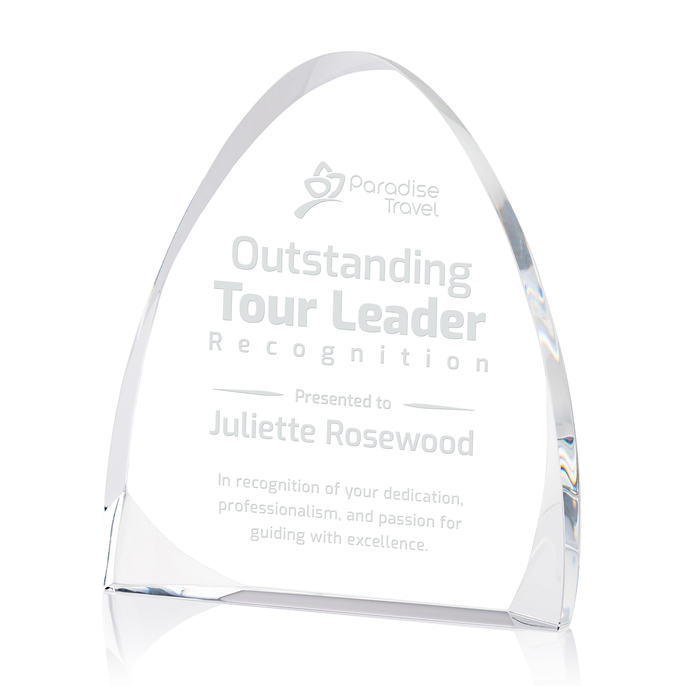 Honor exceptional achievement with the Georgia Peak Award, a breathtaking piece crafted from premium optical crystal. Designed with deep, dramatic bevels, this award captures and reflects light beautifully, creating an eye-catching display that radiates prestige and excellence. Its sleek arched silhouette conveys both elegance and strength, making it an ideal choice for recognizing milestones, leadership, and outstanding performance. The Georgia Peak Award offers a generous imprint area perfect for VividPrint or Deep Etching, allowing company logos, award titles, and recipient names to shine with distinction.