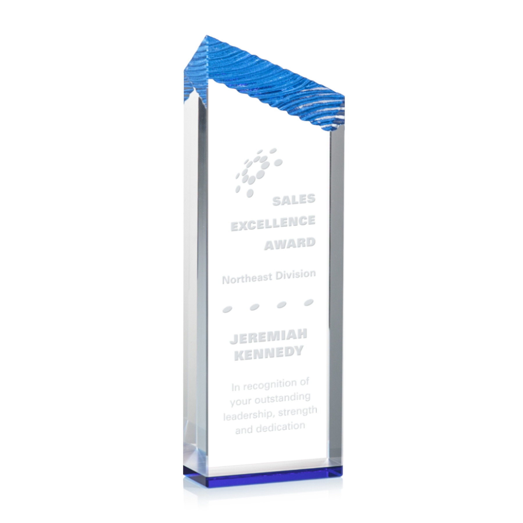 The 7" high Haverhill is a free-standing rectangle transforming at the top into an angled bevel, finely decorated with curved and polished ripples. The latter displays varying hints of blue highlights from the blue optical crystal fused to the bottom of the piece. Small flourishes transform a basic shape into a distinctly novel award. Also available in 8" and 8¾" versions.