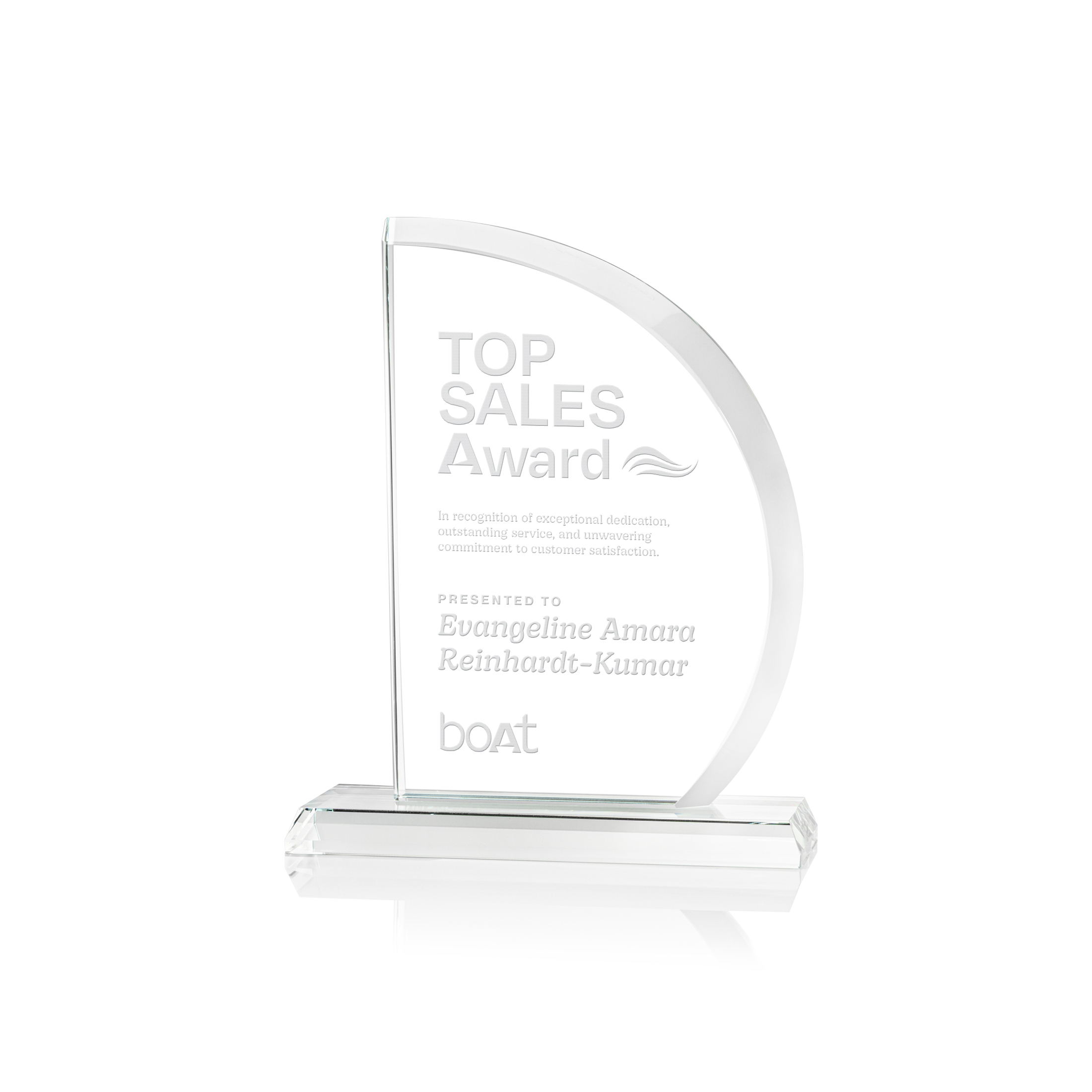 The ¾" thick Truscott Starfire award features a beautiful beveled half moon design that ridges back on the right side and dissolves into its base.
