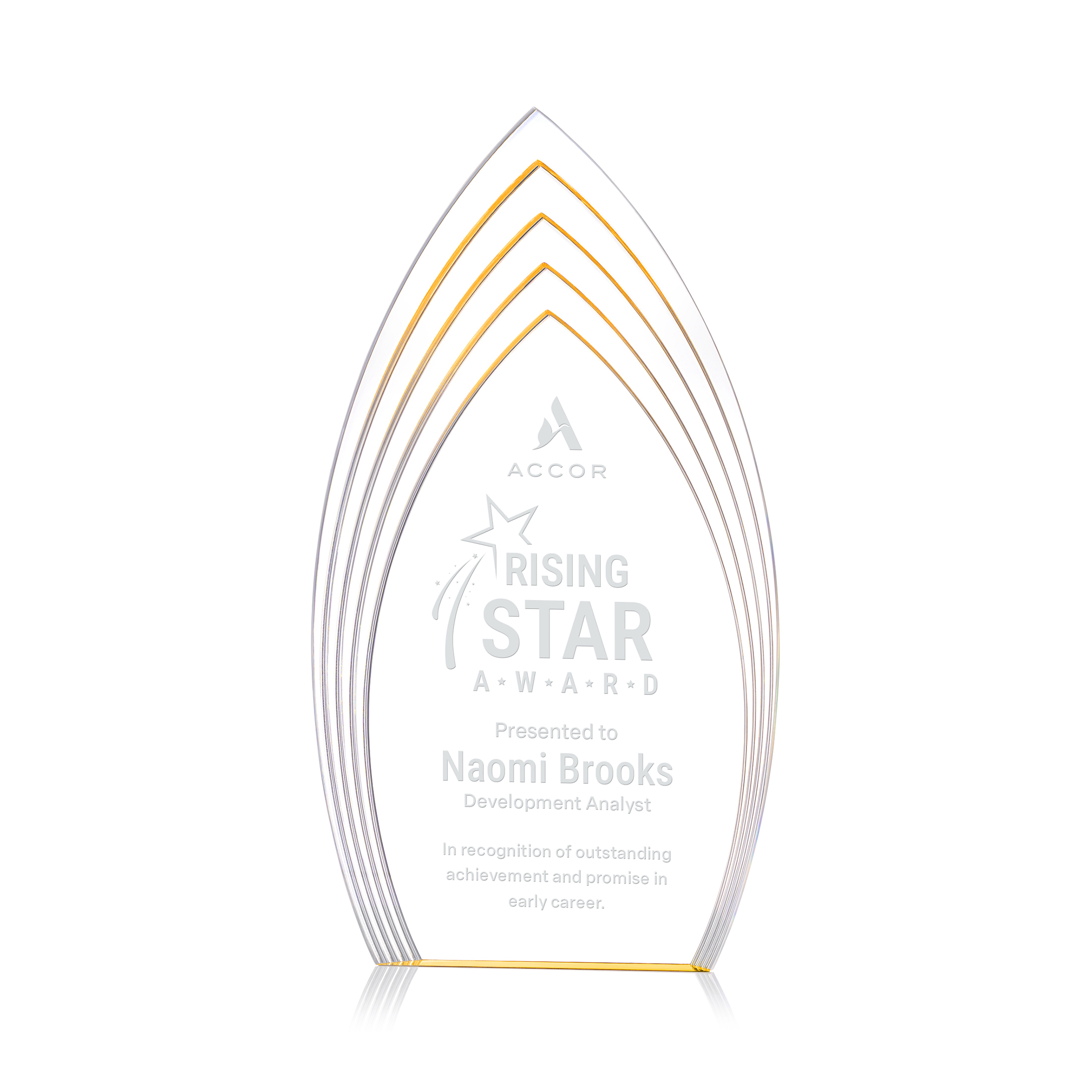 The Turello Acrylic Award is a sleek, freestanding recognition piece designed to make a bold statement. Its modern, layered silhouette features a vibrant color accent at the base that beautifully reflects upward, casting a subtle glow throughout the entire award. Available in gold, sapphire, and clear, the Turello delivers a premium, contemporary aesthetic perfect for honoring excellence at any level.