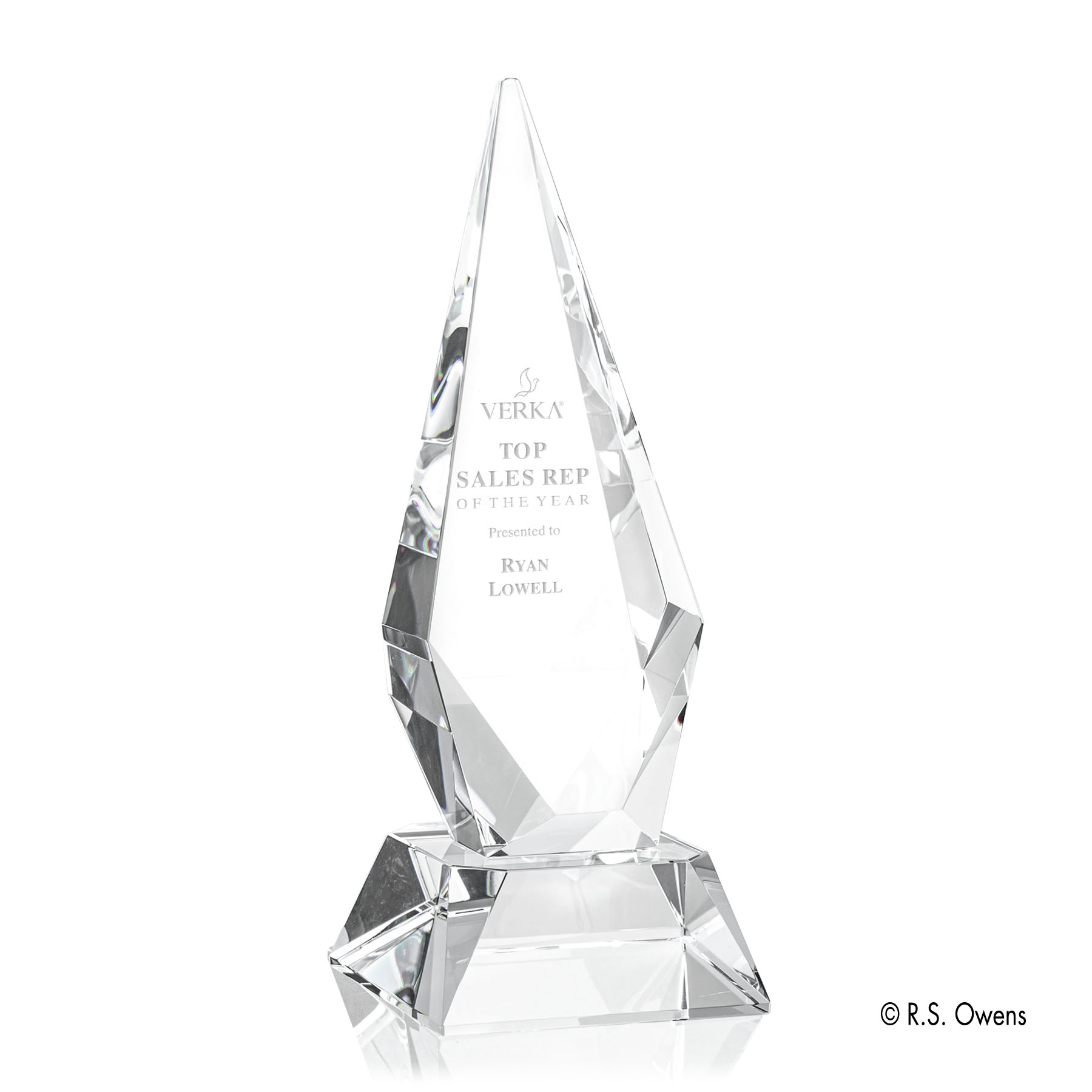 The multiple facets of the Vector create a sparkling presence or refracted light, mounted to our beveled black optical crystal base. Second position etch on base optional.