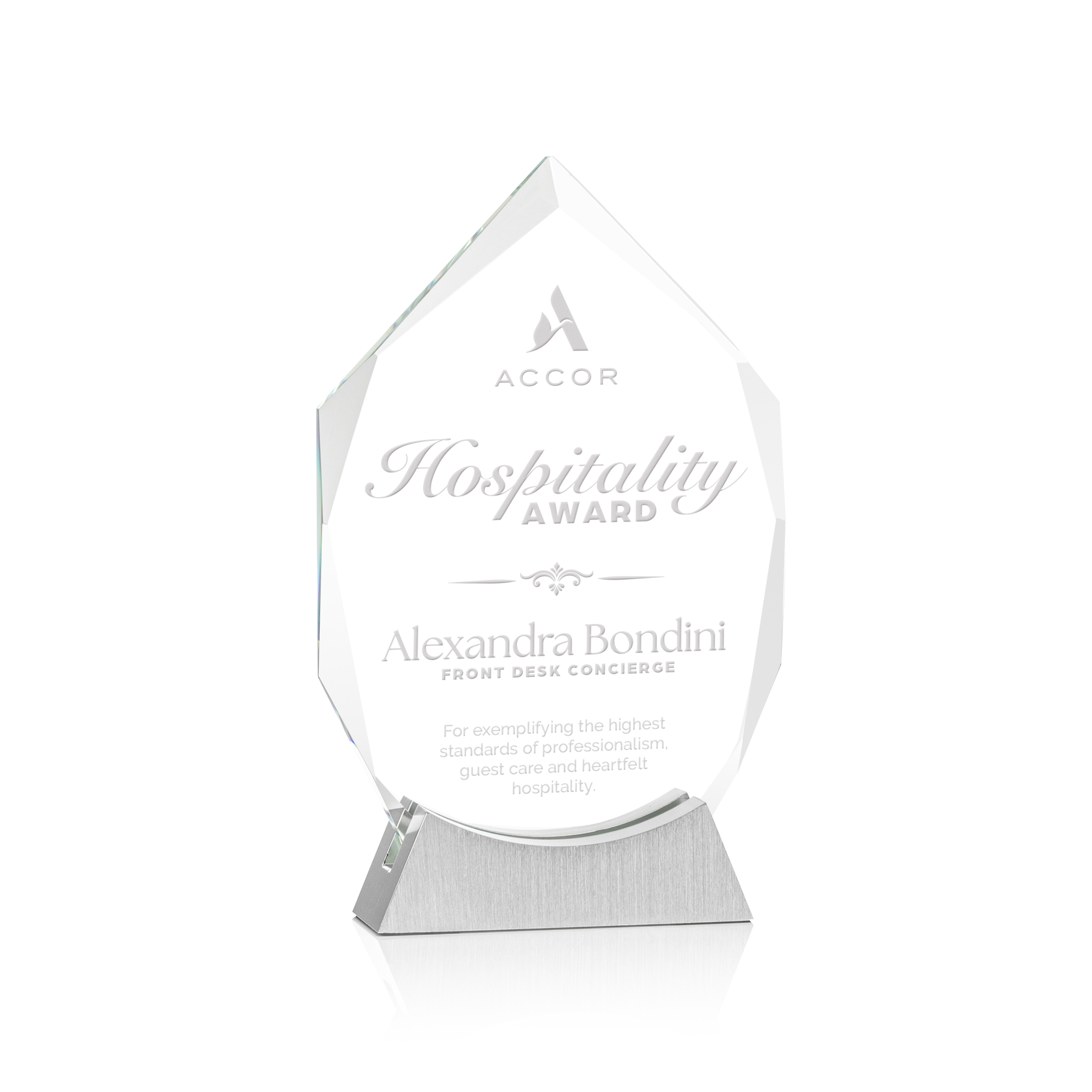 The Westmore Award is a striking recognition piece crafted from premium Starfire crystal with a bold geometric shape and refined beveled edges. It rests on a sleek brushed aluminum base that adds a modern touch to its elegant design. Ideal for celebrating excellence and achievement, this award offers customizable engraving to honor every milestone with distinction.