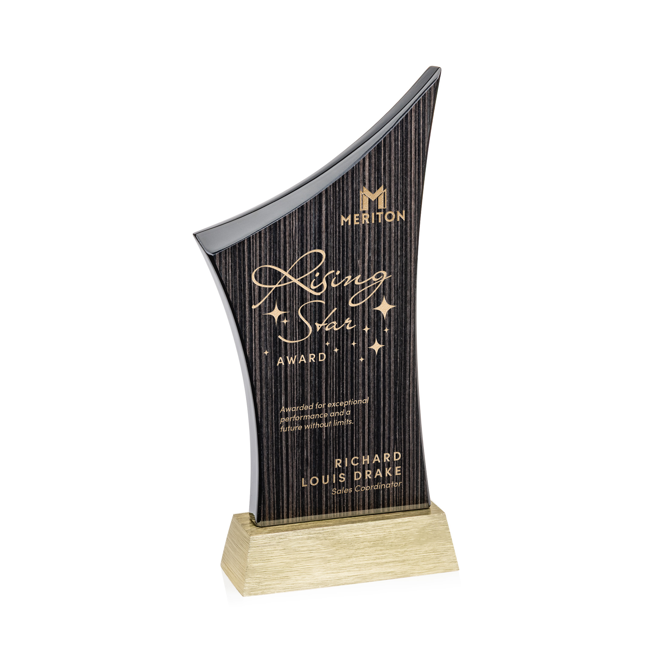 This award features a striking curved silhouette that sweeps upward with a modern, asymmetrical arc, creating a bold and dynamic presentation. The rich slatewood-inspired composite backdrop adds depth and texture, beautifully contrasted by a brushed aluminum base for a refined finish. Available in your choice of gold or silver, it’s a sophisticated way to recognize outstanding achievement.