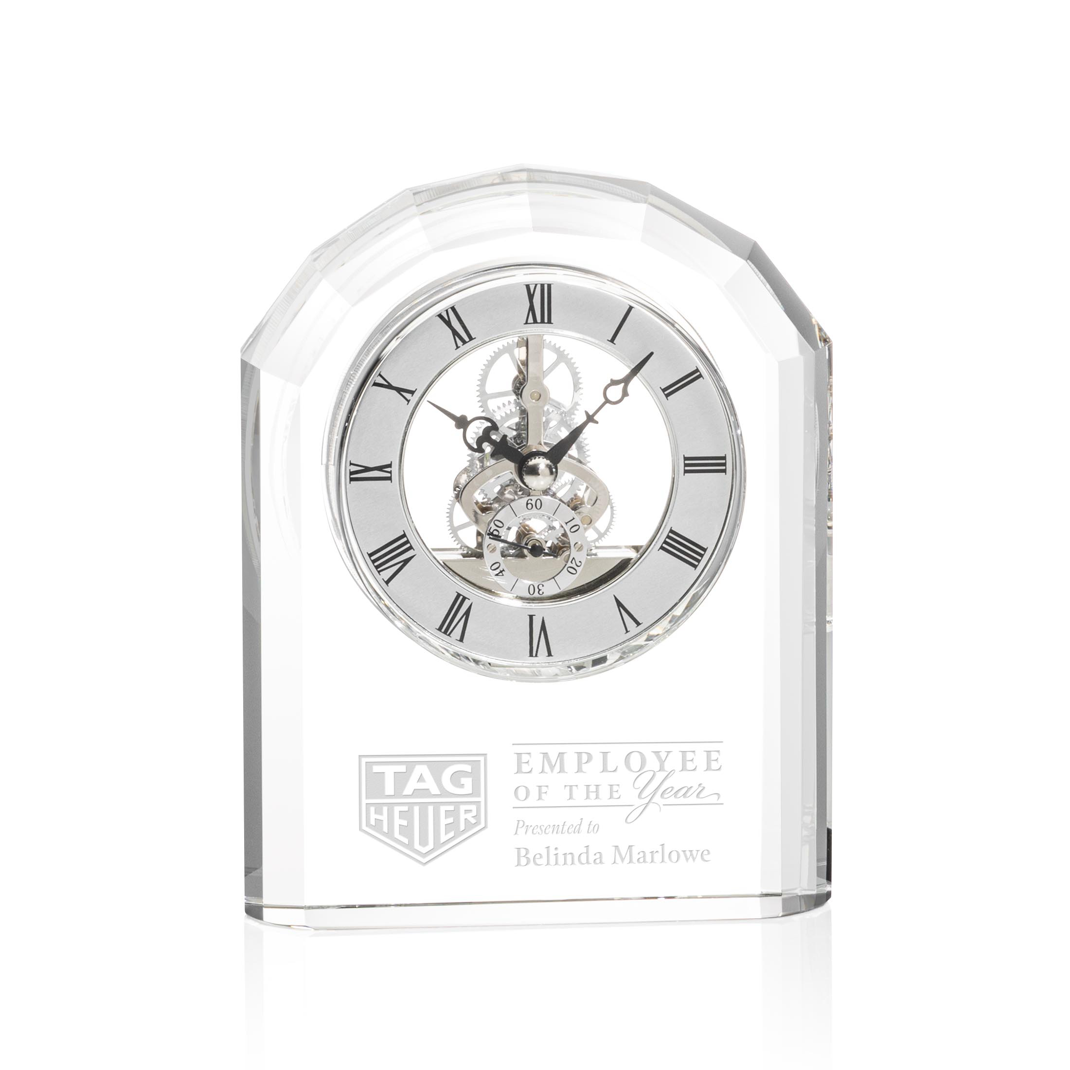 The Birkdale Clock features a beautifully curved optical crystal body set atop a sleek base, creating a timeless silhouette. Its silver mechanical clock face adds a classic touch, making it a distinguished piece for any desk or display.