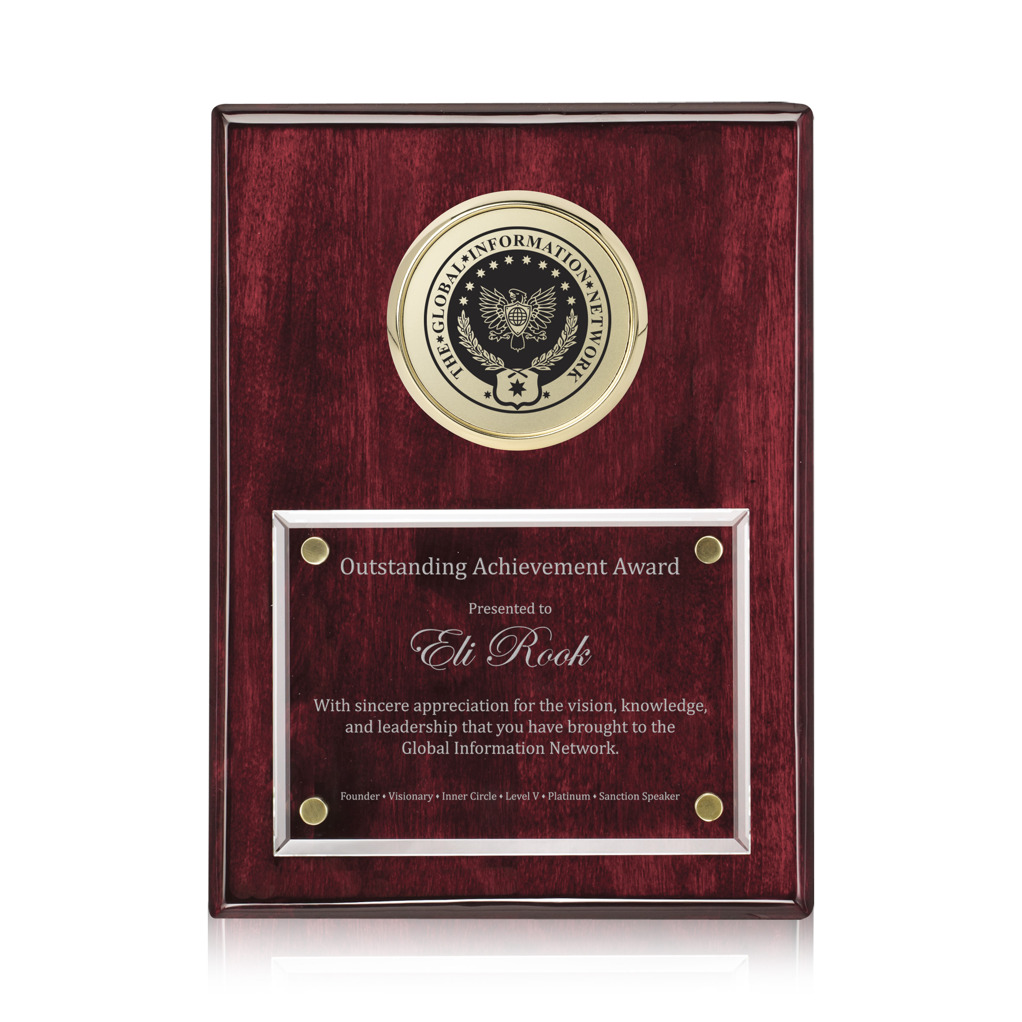 High-gloss Piano Finish Plaque. Deep etched beveled Starfire Crystal elegantly mounted below a chrome rimmed laser engraved medallion. Full Color medallion imprinting also available.