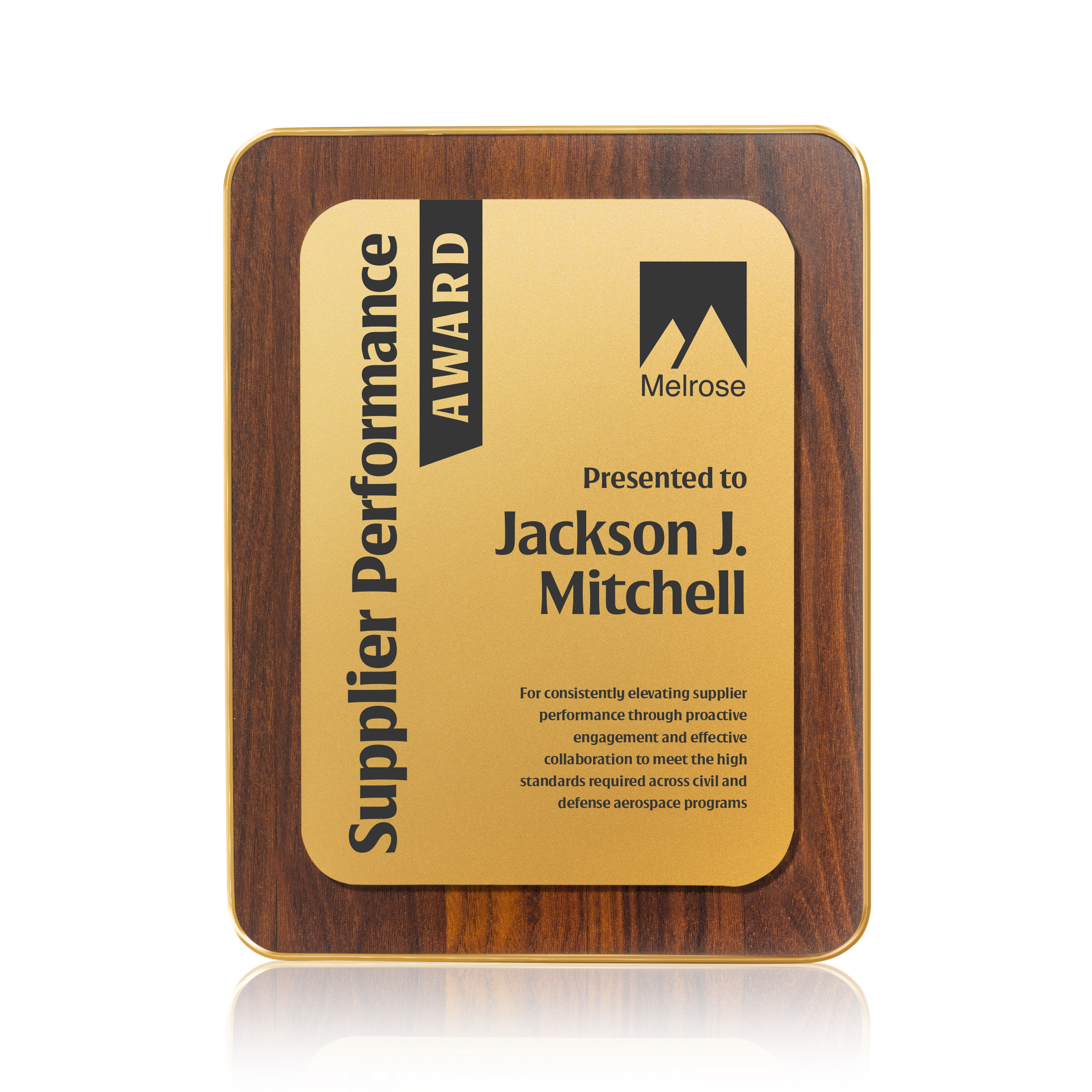 The Reston Plaque features a rich walnut-finish frame paired with a sleek gold or silver plate for a refined, professional look. An elegant metal border surrounds the plaque, adding a distinctive and sophisticated accent that enhances the plaque’s overall presentation. Its clean lines and rounded corners create a timeless design that beautifully showcases custom engraving, logos, and personalized messaging. Perfect for corporate recognition, supplier awards, and milestone achievements, this plaque delivers lasting impact with classic elegance. Can be wall-mounted and includes an easel pin for desktop display.