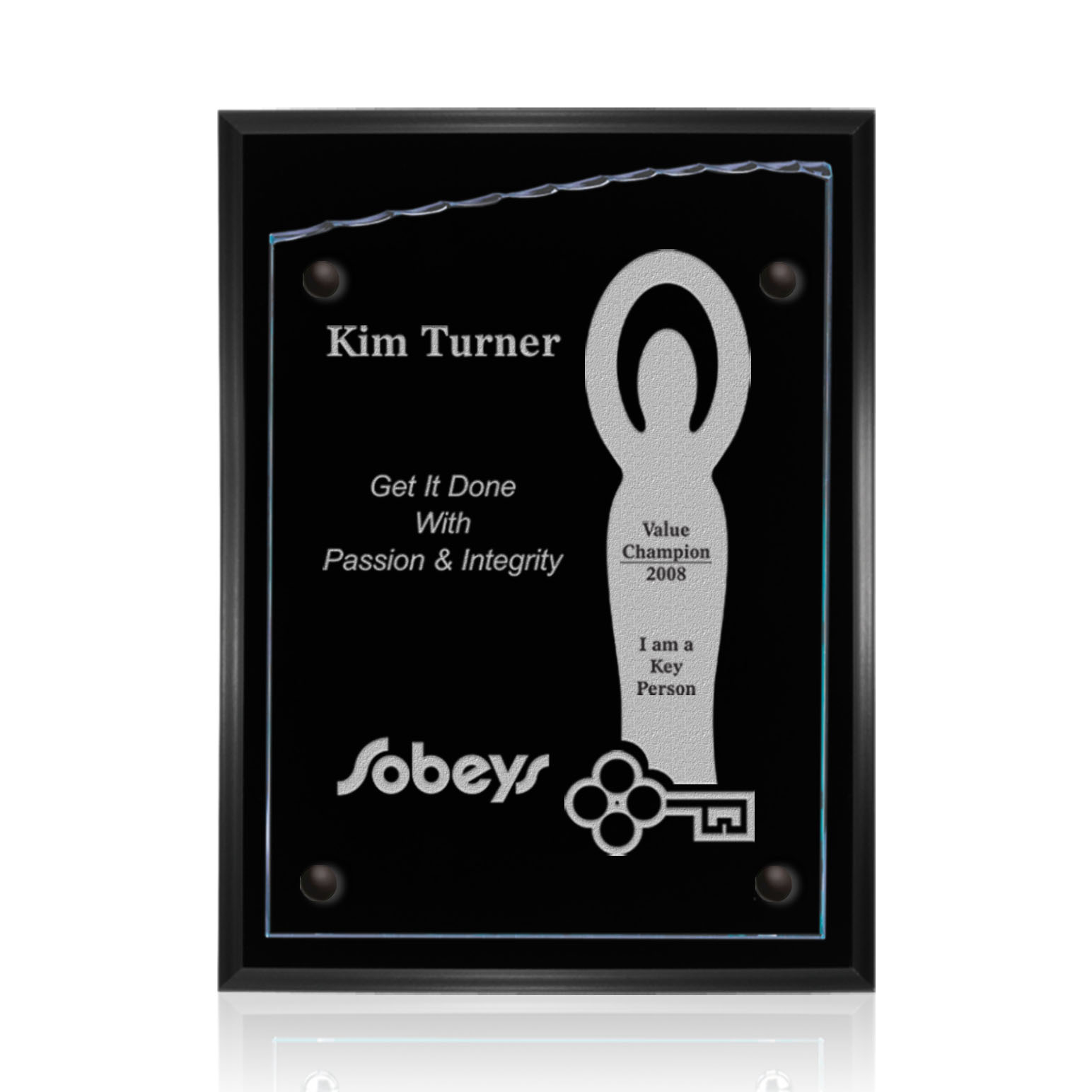 The 7" X 9" Simcoe plaque features 3/8" Starfire glass with a chipped, polished, and sloped top edge and black wood product backing. Also available in 8" X10", 9" X 12" and 10.5" X 13" versions, and with rosewood-colored wood product backing.