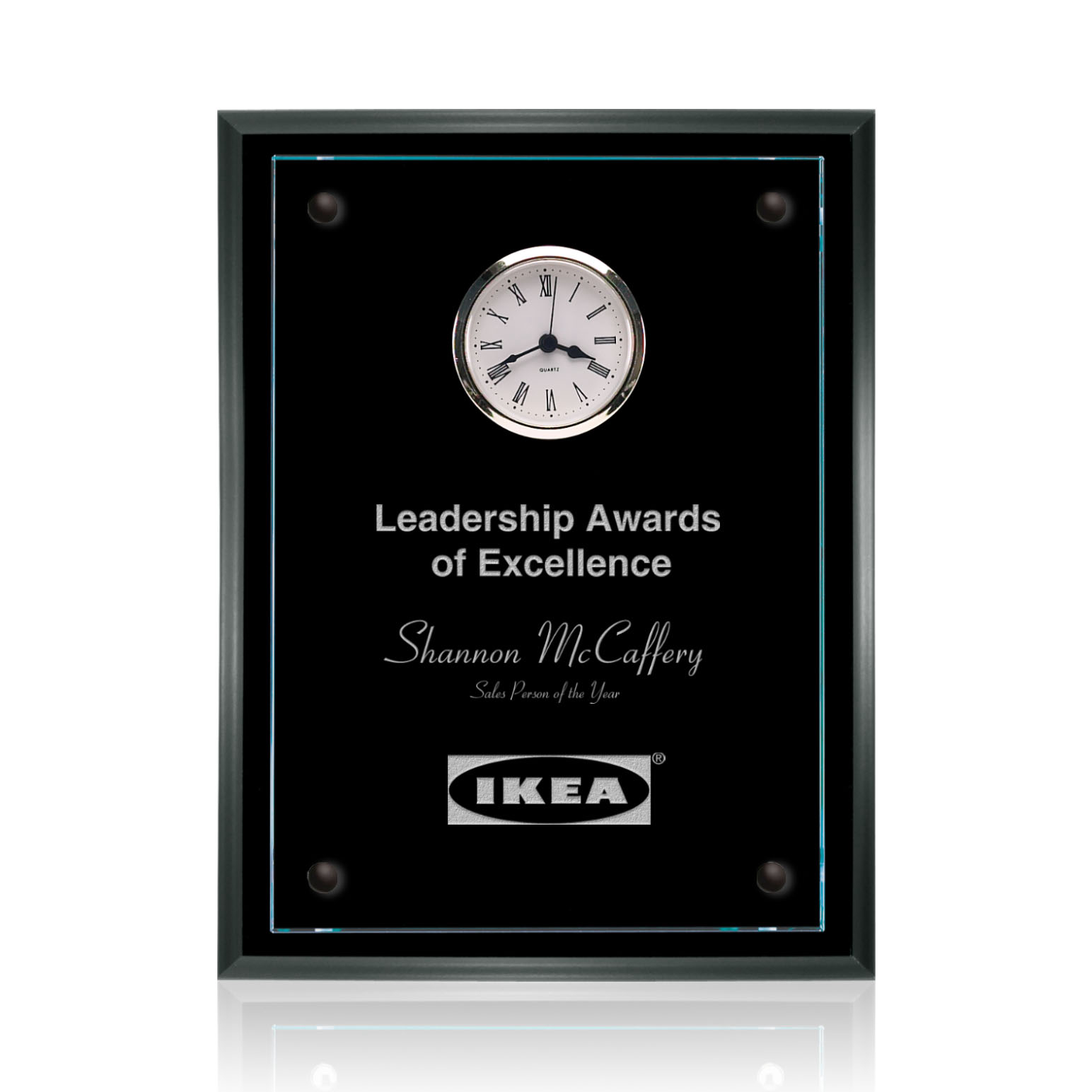 The 7" X 9" Somerset plaque features a clock insert in the 3/8" starfire glass and a black MDF backing. Also available in 8" X 10" and 9" X 12" sizes and with rosewood-colored backing.
