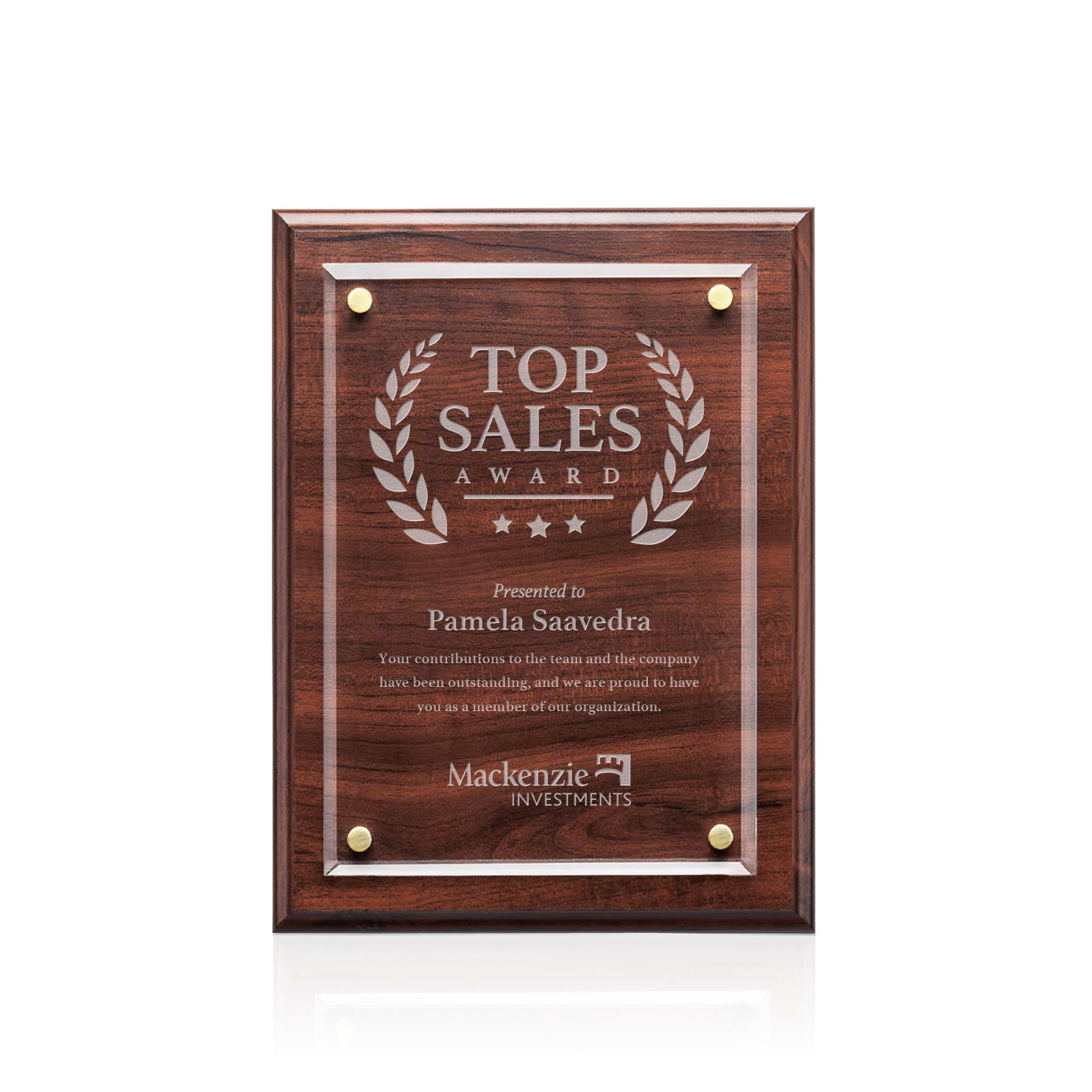 The beveled crystal center plate of the Ulster is raised above the cherry finished wood surface by elegant gold stand offs to create this elegant statement of sophistication.