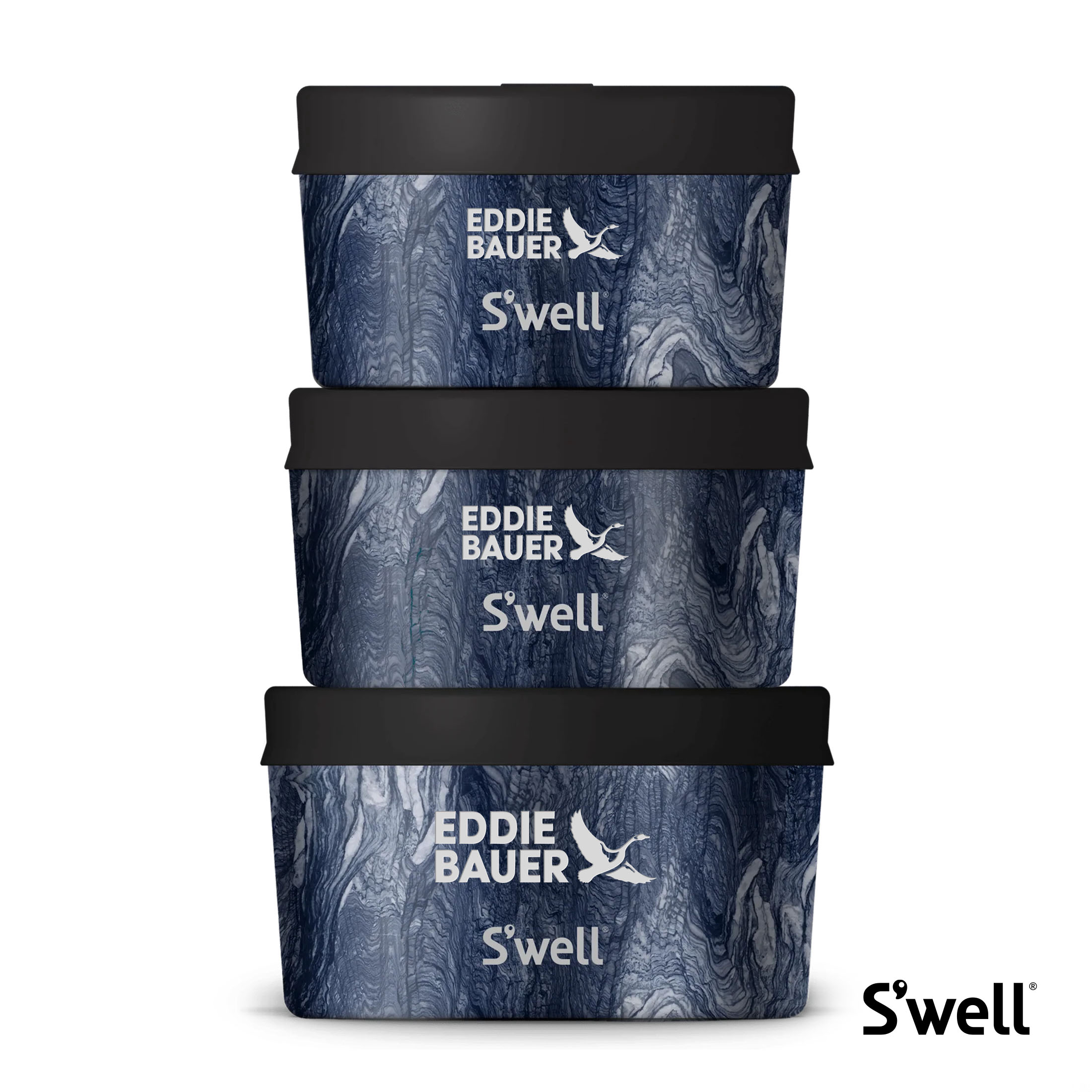 Food stays fresh in the pantry, fridge, or on-the-go with the versatile S’well Food Canisters. Features: - Comes in a nested set of three sizes (10oz, 16oz, and 24oz) that can be nested together to save space in your cabinet. - Ideal for leftovers and snacks like nuts, yogurt, chips, and more. - Single-walled, durable construction. - Lightweight and easy to transport. - Refrigerator and freezer-friendly. - Leakproof silicone lid. - 18/8, food grade stainless steel. - BPA/BPS-free and reusable. - Dishwasher safe or hand wash with warm soapy water. Product Size: 10oz - 4" W x 2.4" H x 4" D 16oz - 4.7" W x 2.6" H x 4.7" D 24oz - 5.2" W x 3" H x 5.2" D